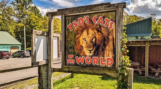 T & D’s Cats of the World provides a permanent home for these animals and open each summer to share their beauty with you. Nearly 300 animals call T&D’s home, including 50 felines (lions, tigers, cougars, leopards, bobcats, servals, and lynx). Other animals – bears, fox, deer, coyotes, wolf-dogs, raccoons, primates, parrots, and others – have also found their way to T&D’s.